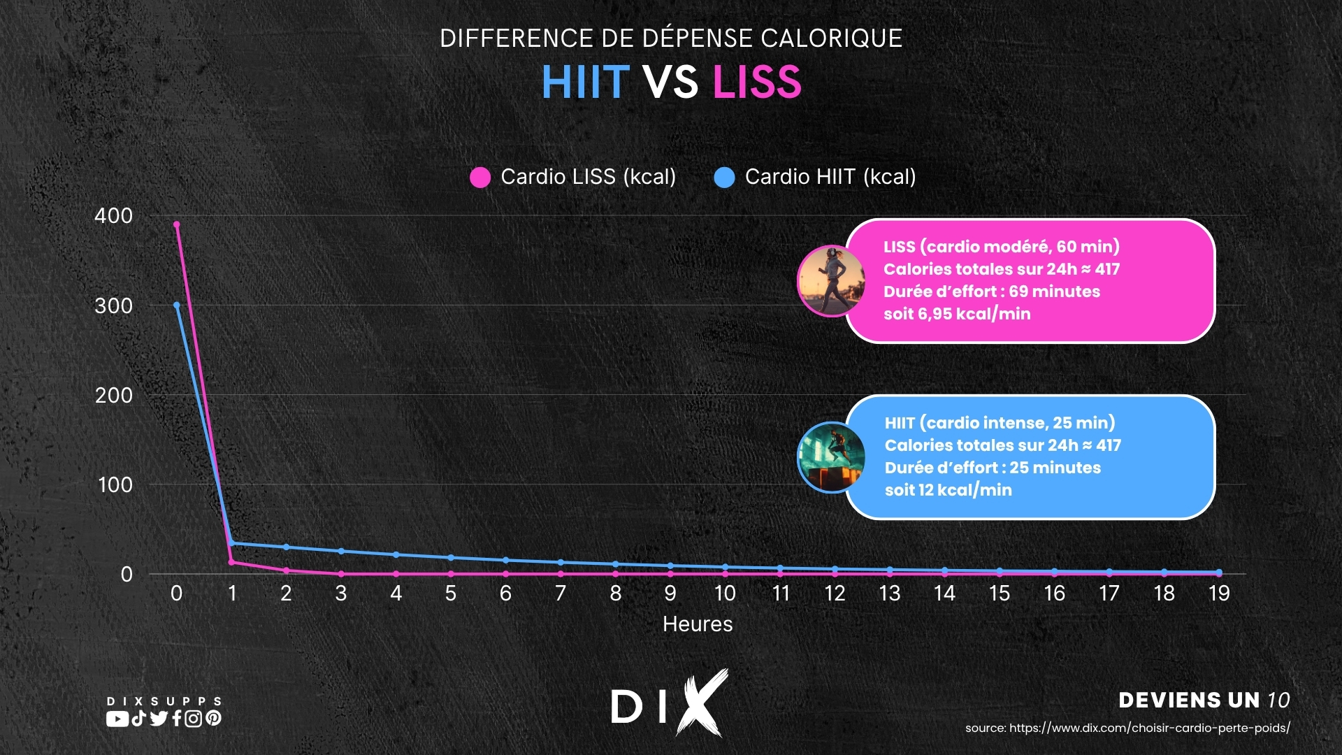 - Le HIIT brûle plus en moins de temps : Grâce à l’effet EPOC, le corps continue de consommer des calories plusieurs heures après l’effort. Idéal pour les pratiquants expérimentés cherchant une perte rapide, à condition d’éviter le surentraînement.