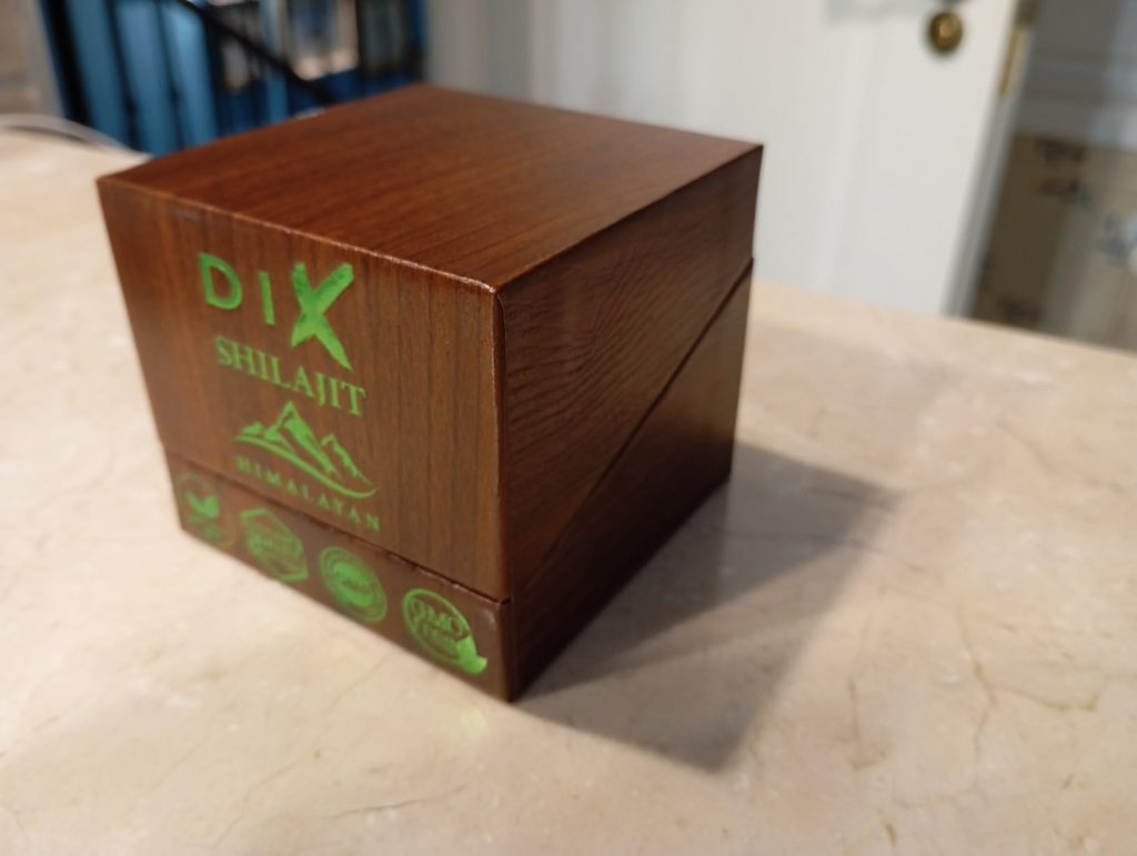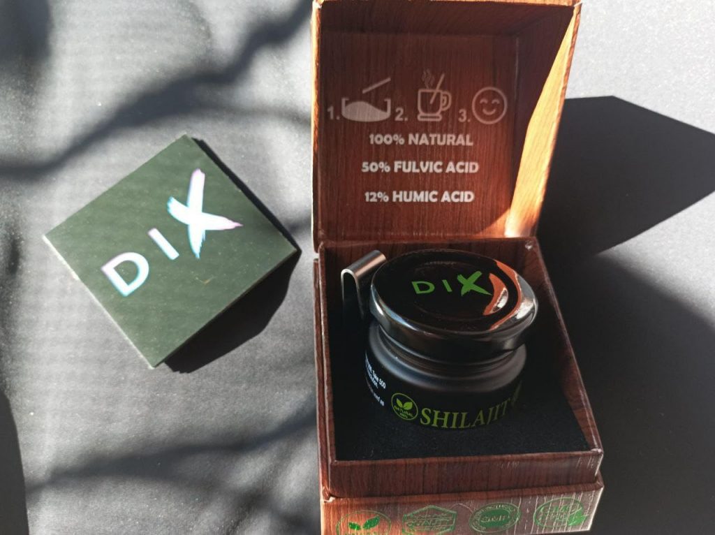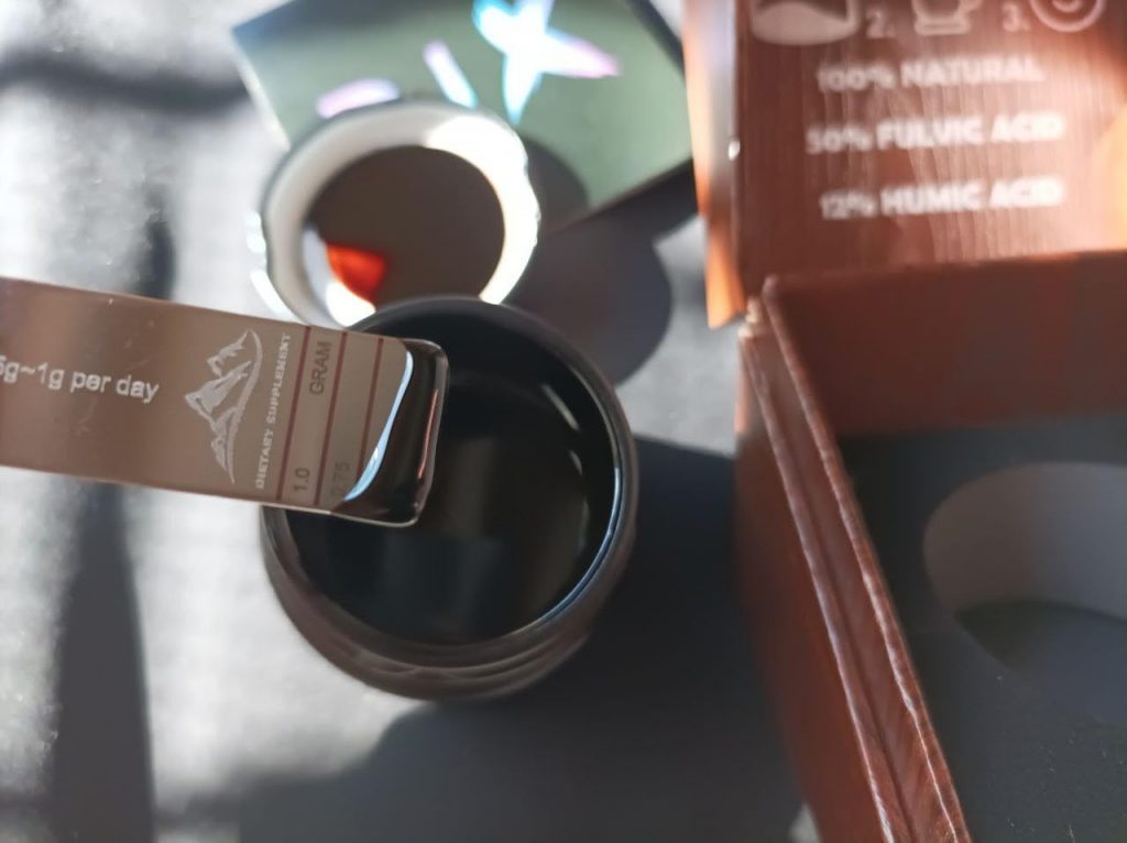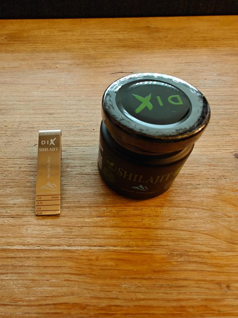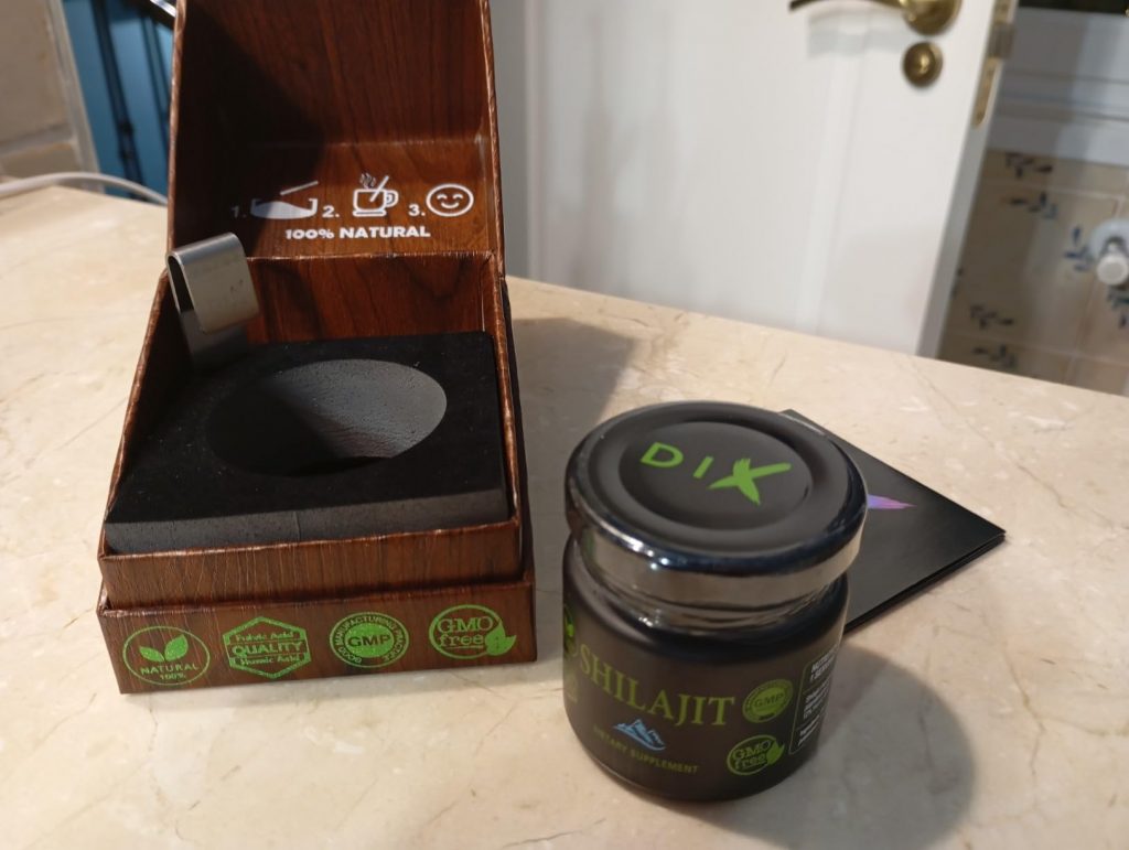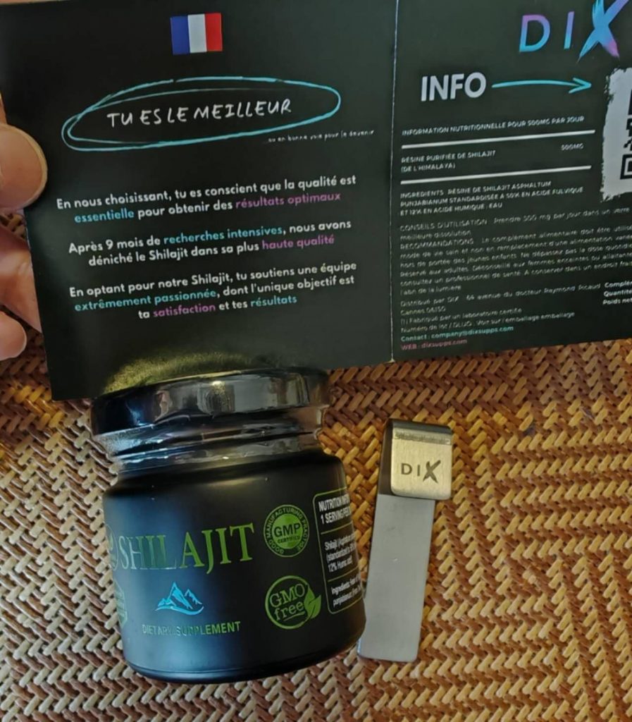 Le shilajit est une résine provenant des montagnes de l’Himalaya, pleine de minéraux et d’oligo-éléments. Il aide donc à booster notre système immunitaire. Ce shilajit est proposé dans un petit coffret pratique pour le transport, avec un doseur que l’on peut accrocher à sa tasse de thé. Il se dissout facilement et colore la boisson. Comme conseillé, je le prends à 0,5 grammes et je n’ai rencontré aucun problème. C’est une marque de Cannes.