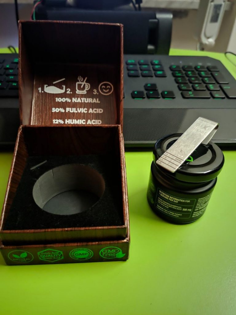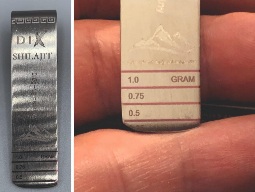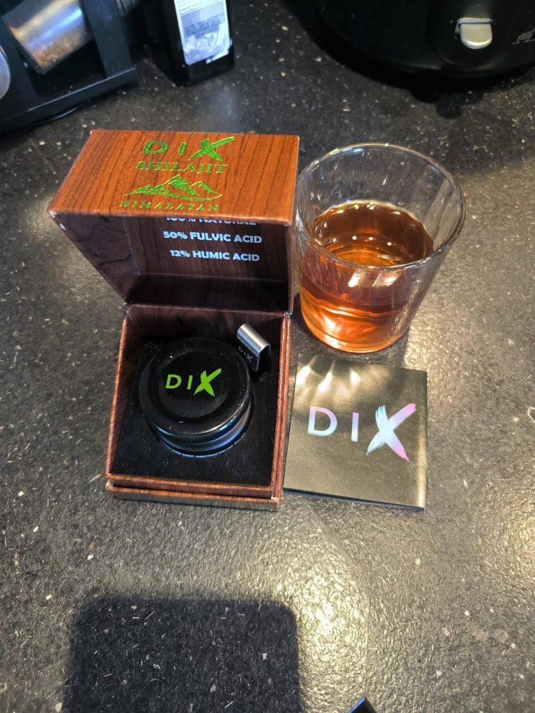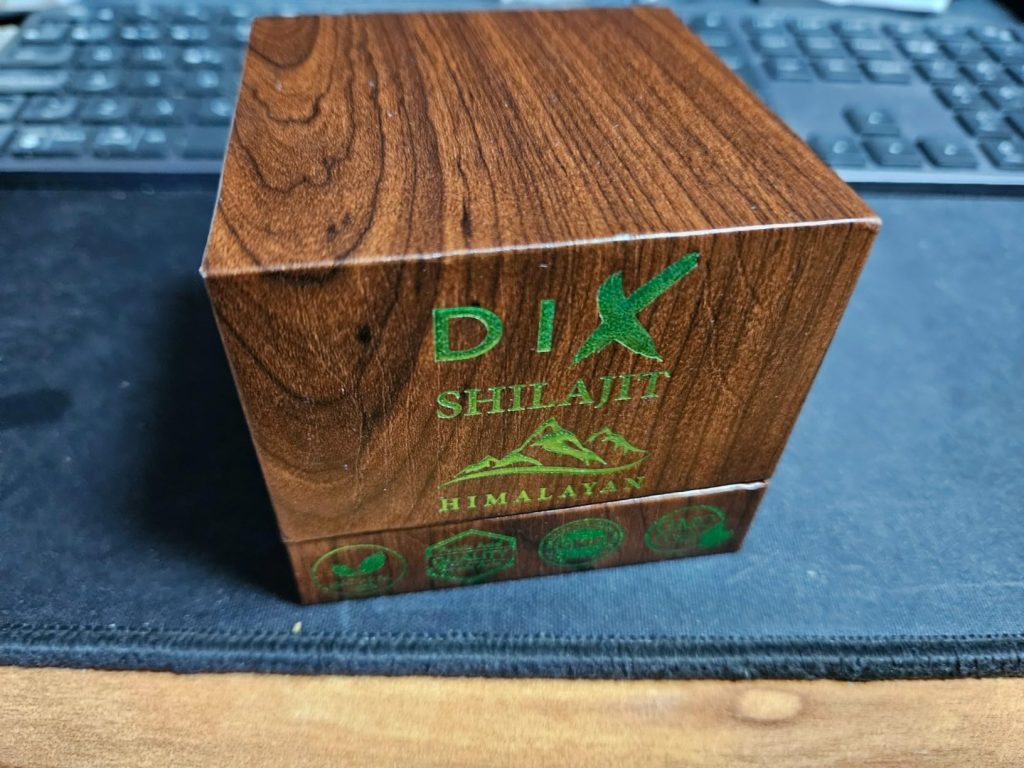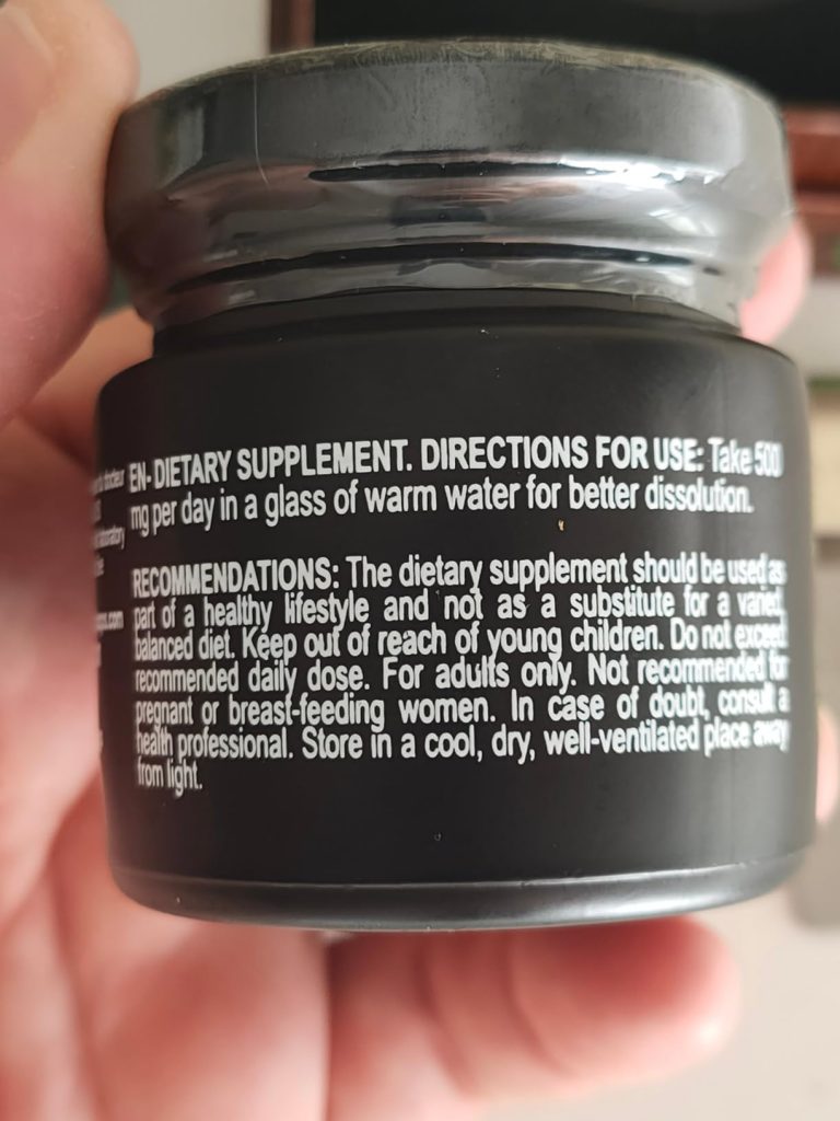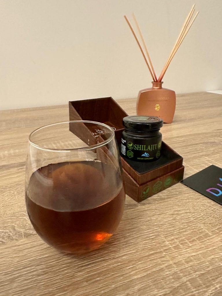 Le shilajit est une résine provenant des montagnes de l’Himalaya, pleine de minéraux et d’oligo-éléments. Il aide donc à booster notre système immunitaire. Ce shilajit est proposé dans un petit coffret pratique pour le transport, avec un doseur que l’on peut accrocher à sa tasse de thé. Il se dissout facilement et colore la boisson. Comme conseillé, je le prends à 0,5 grammes et je n’ai rencontré aucun problème. C’est une marque de Cannes.