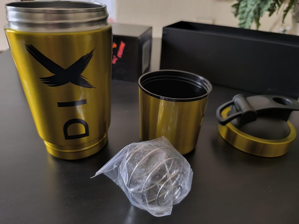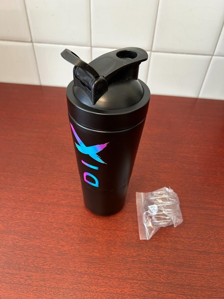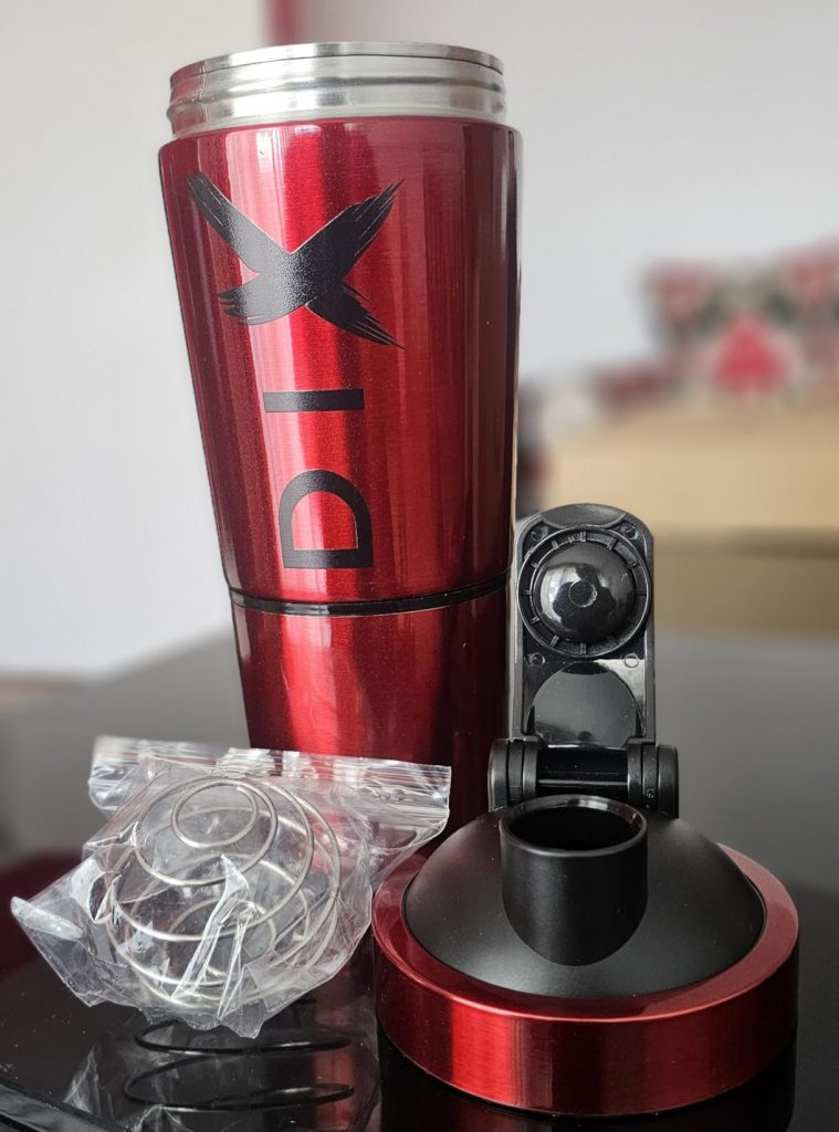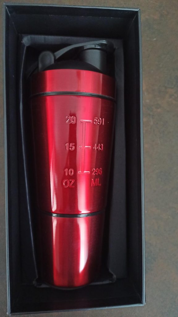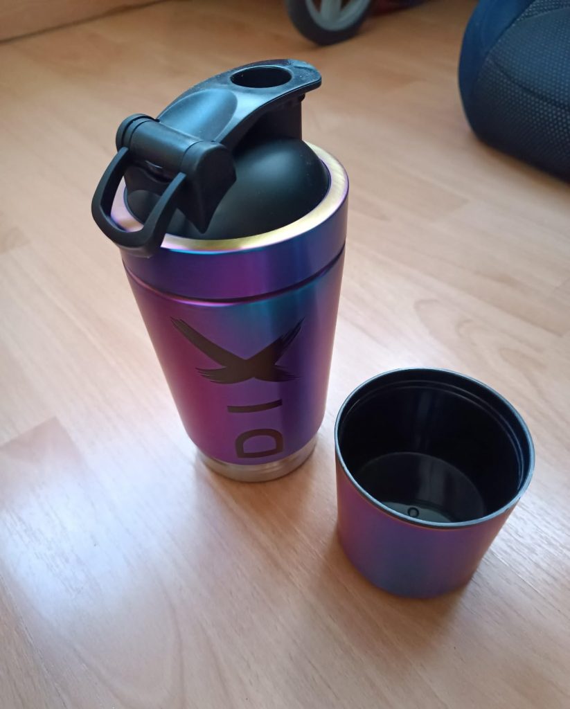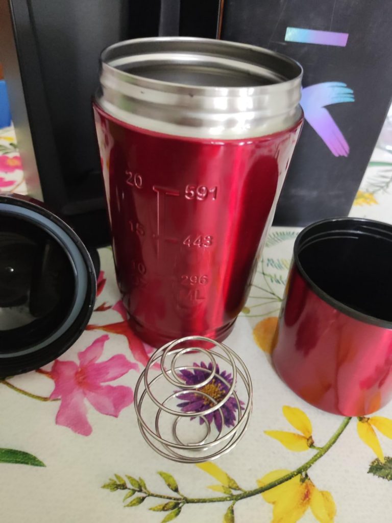Un shaker vraiment joli ! Il est très bien présenté et inclusif, avec un compartiment vissé et une boule qui, après utilisation, s’avère très efficace pour un bon mélange. On constate tout de suite que la qualité est au rendez-vous : l’acier inoxydable est bien rigide, contrairement à d’autres modèles concurrents qui se déforment facilement. Je recommande ce shaker à ceux qui veulent prendre leur protéine juste après l’entraînement, il fait parfaitement son job.
