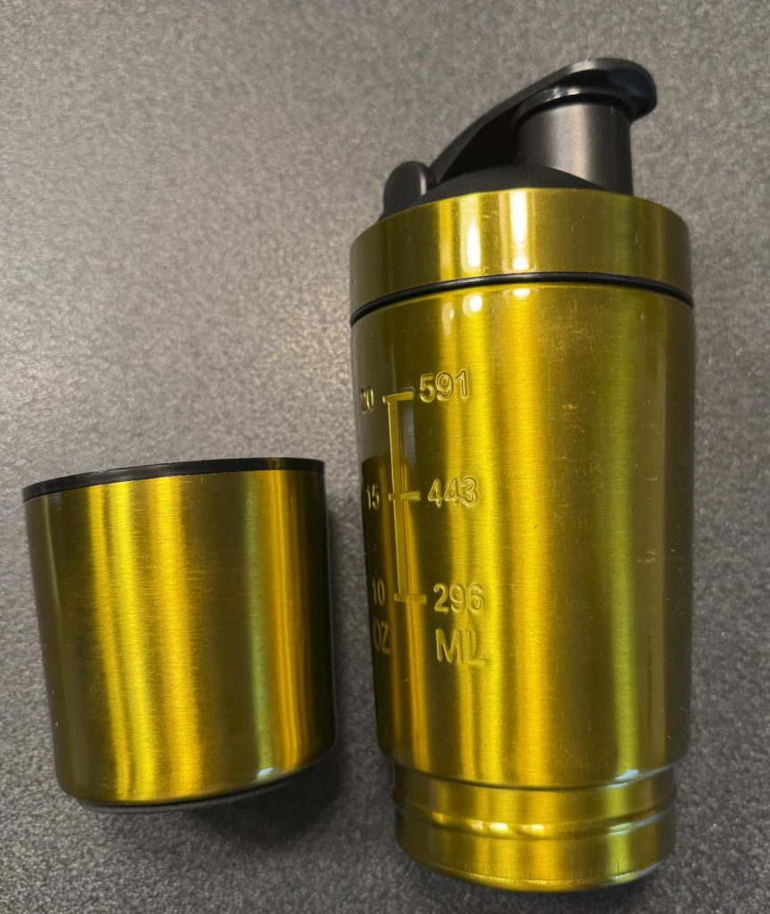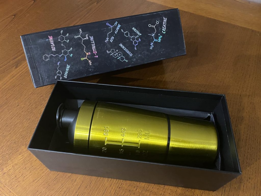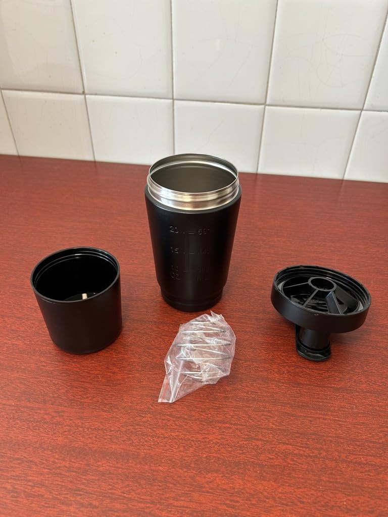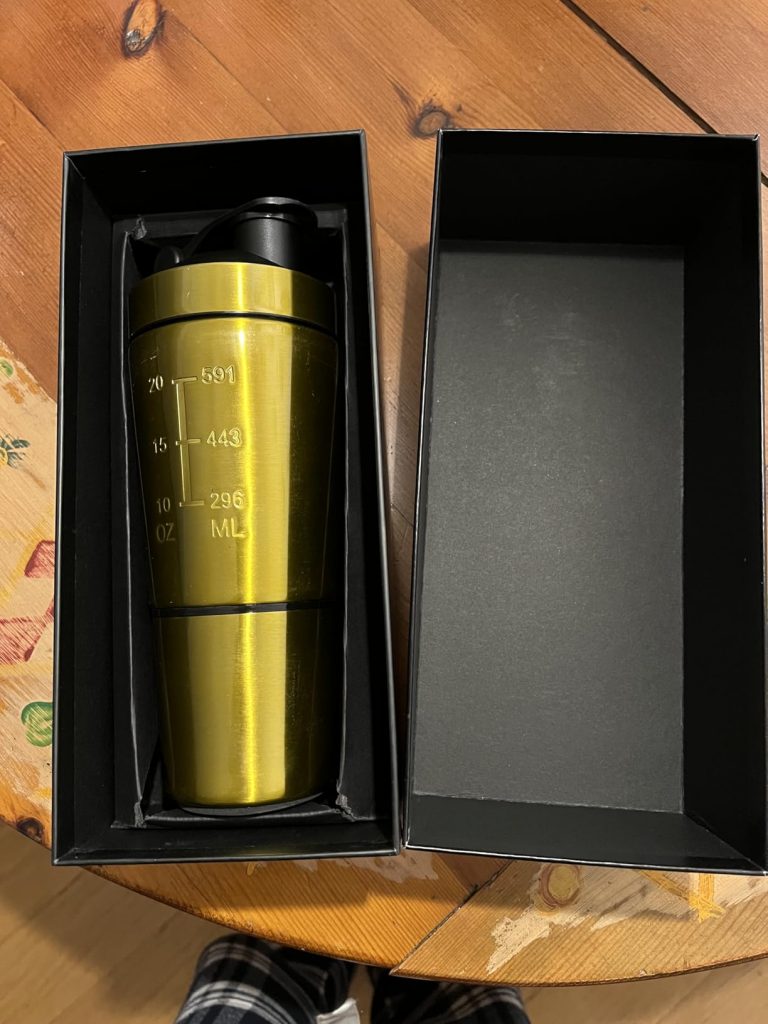 Le shaker en acier inoxydable remplit parfaitement son rôle. Son design doré avec des inscriptions noires le rend vraiment élégant. Il possède un compartiment pour une dose de protéines supplémentaire et un réservoir principal de 750 ml, équipé d’une boule pour éviter les grumeaux. Le couvercle, avec sa prise pratique et son mécanisme de fermeture robuste, assure une bonne étanchéité. Cependant, le modèle reçu présente quelques marques de frottement sur la surface à divers endroits, et le joint en silicone a tendance à se détacher, ce qui peut entraîner une perte. En somme, c’est un bon produit, à la fois efficace, esthétique et robuste, malgré quelques petites imperfections !