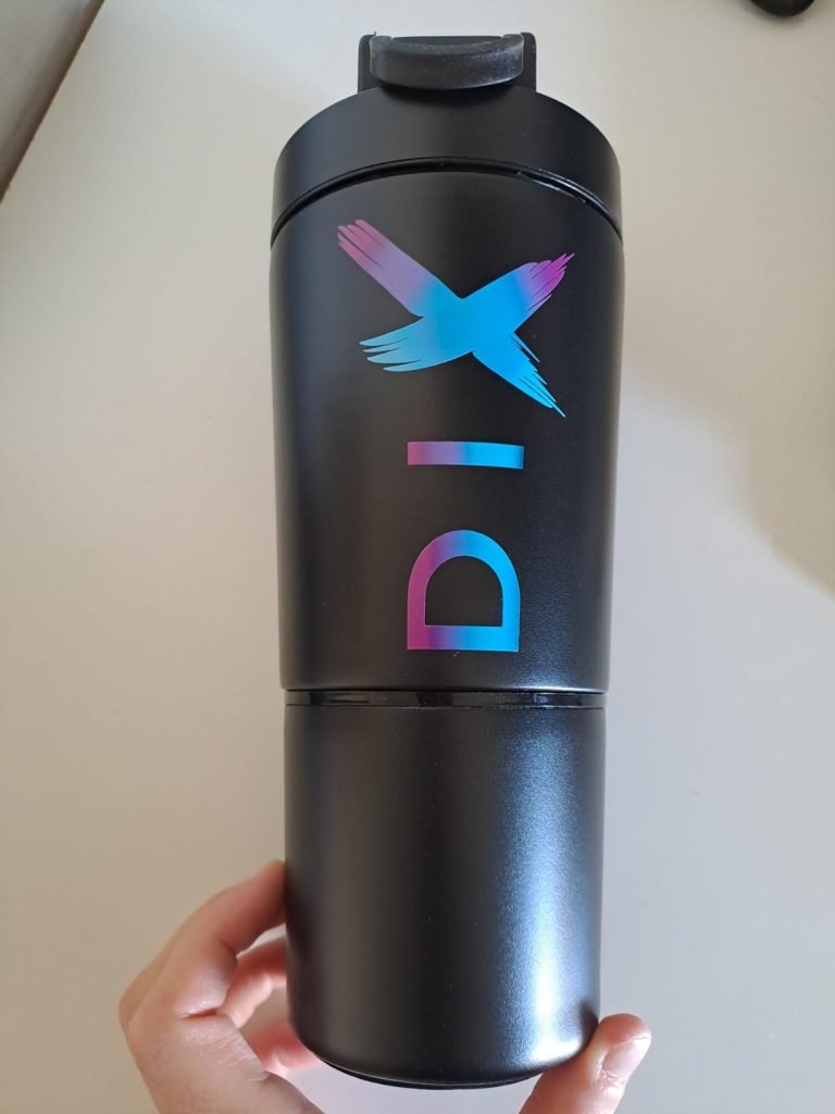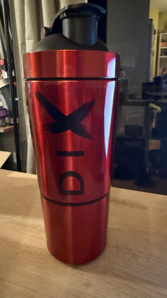 Génial shaker en inox, ce qui garantit une utilisation sans risque. Il dispose d’un compartiment pour stocker 60g de protéines, avec des mesures internes qui facilitent le dosage. L’anneau permet de le transporter facilement, et sa capacité de 750ml est parfaite. Son design est à la fois esthétique et moderne, et le système anti-grumeaux en inox fonctionne très bien !