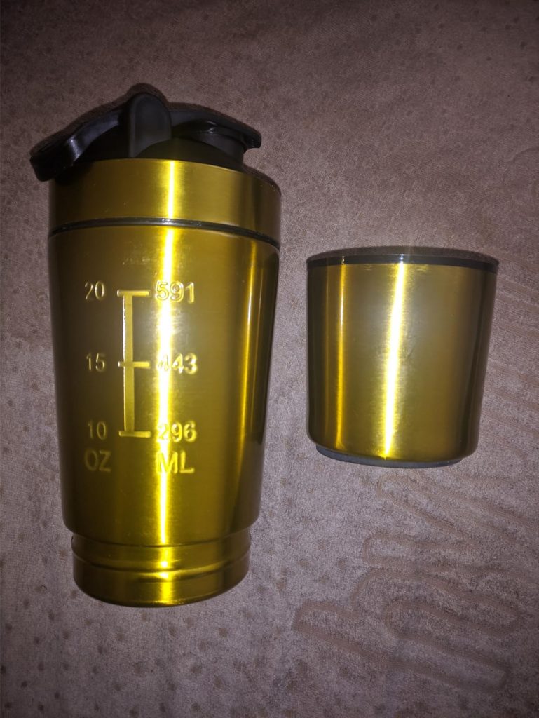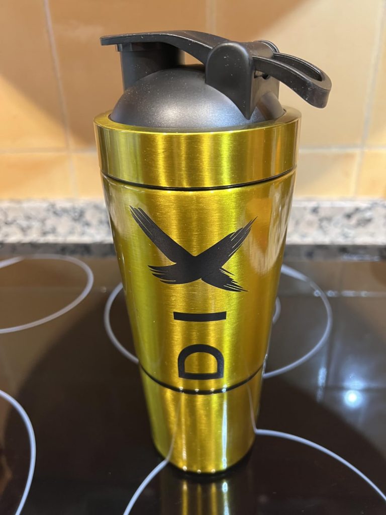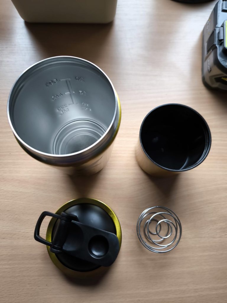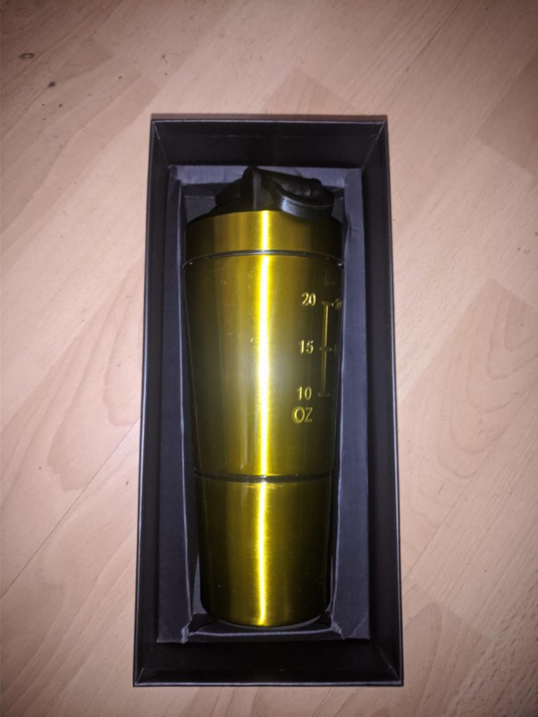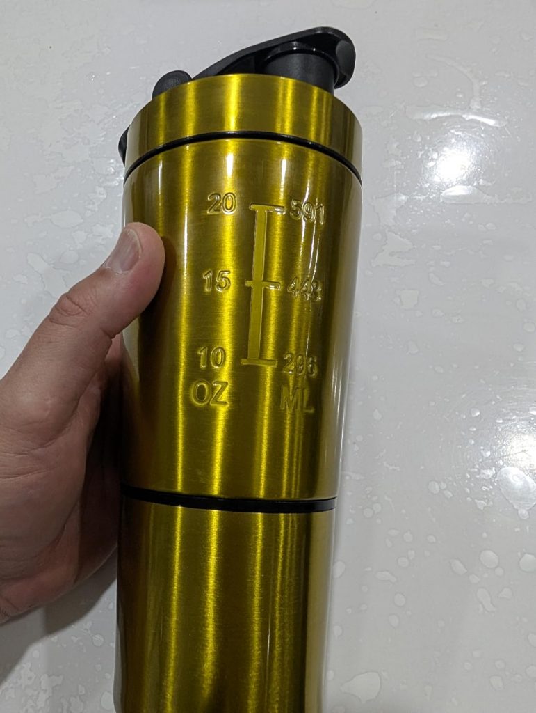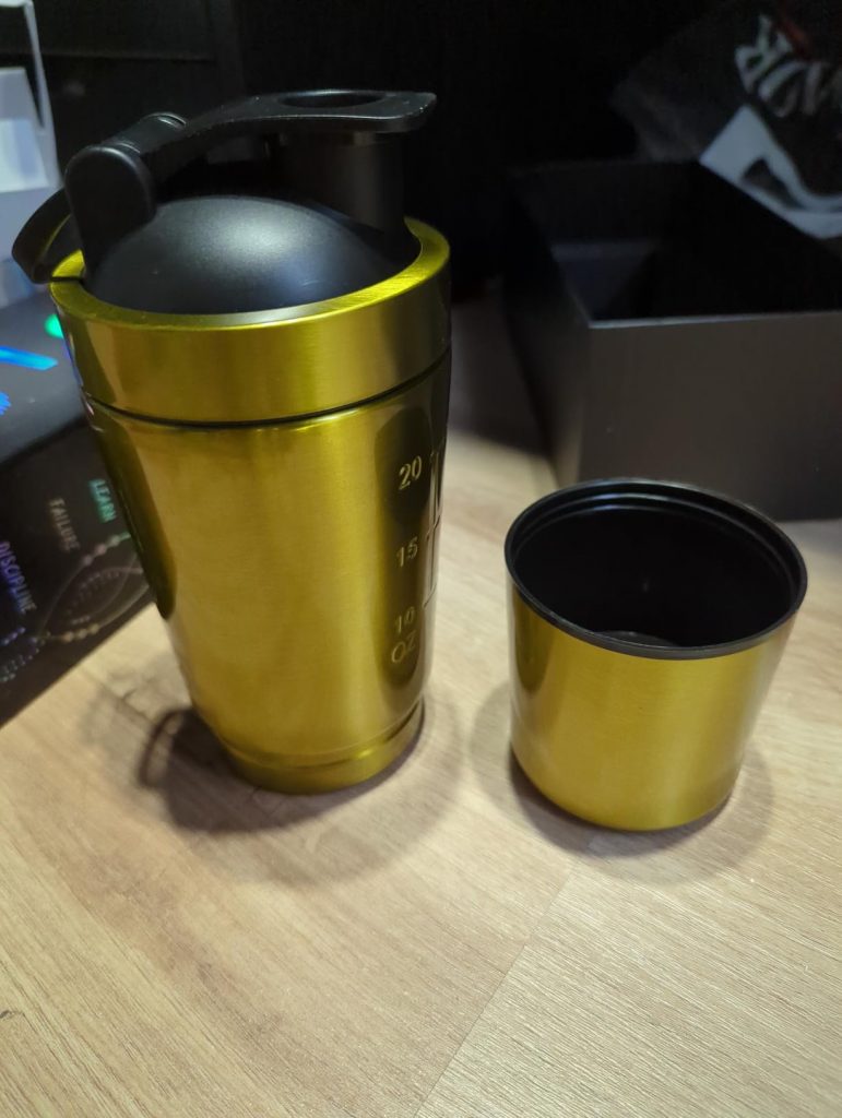Le shaker en acier inoxydable remplit parfaitement son rôle. Son design doré avec des inscriptions noires est vraiment élégant. Il dispose d’un compartiment pour une dose supplémentaire de protéine et d’un réservoir principal de 750 ml, équipé d’une boule pour éviter les grumeaux. Le couvercle a une anse pratique et un système de fermeture robuste qui assure une bonne étanchéité. Cependant, j’ai remarqué quelques marques de frottement sur la surface à certains endroits, et le joint en silicone a tendance à se défaire, ce qui peut entraîner des risques. Un produit qui est à la fois efficace, esthétique et solide, même s’il présente quelques défauts !