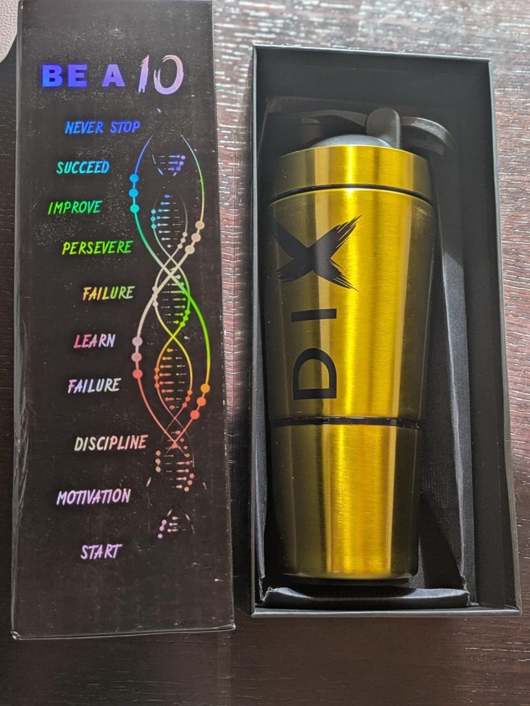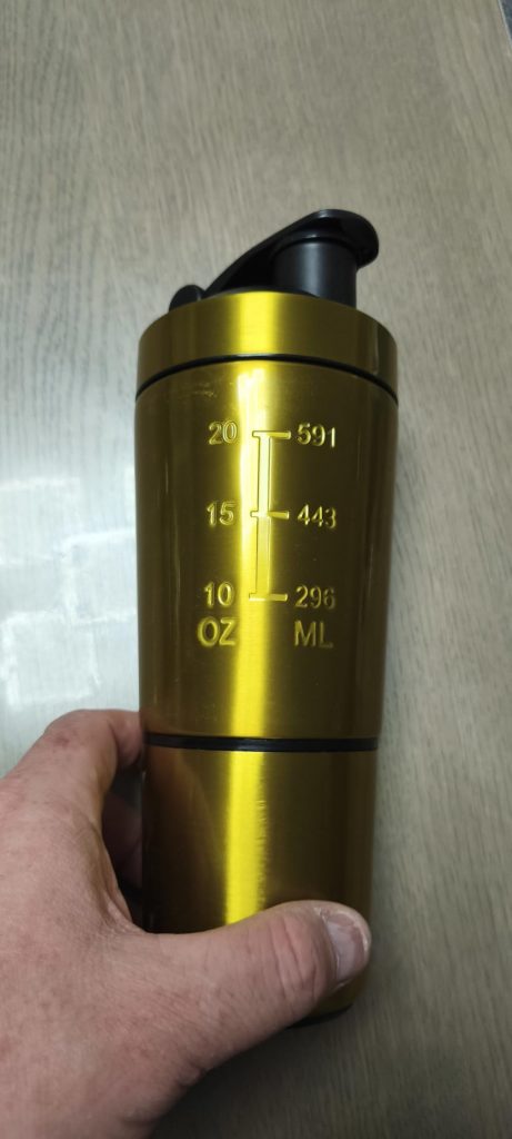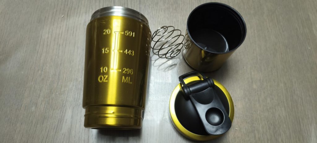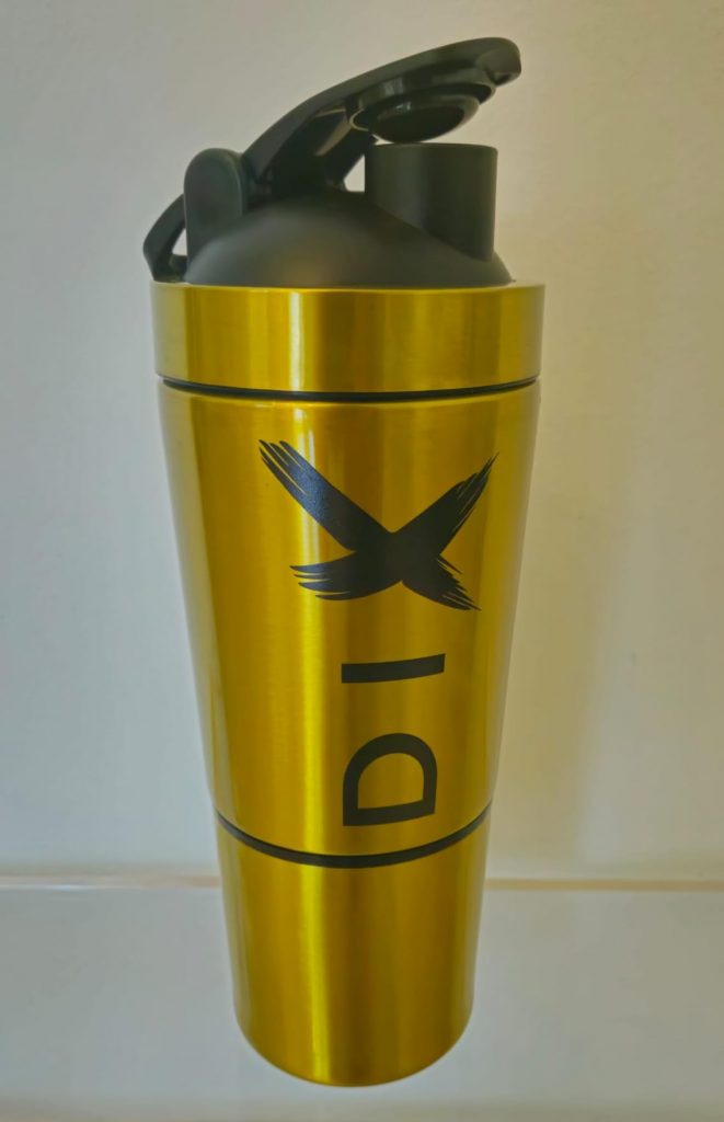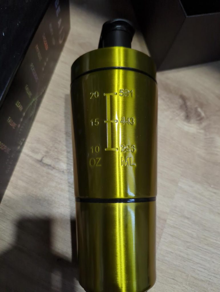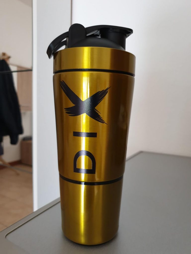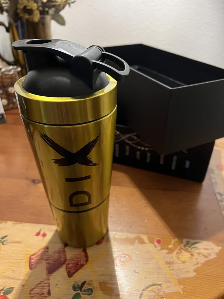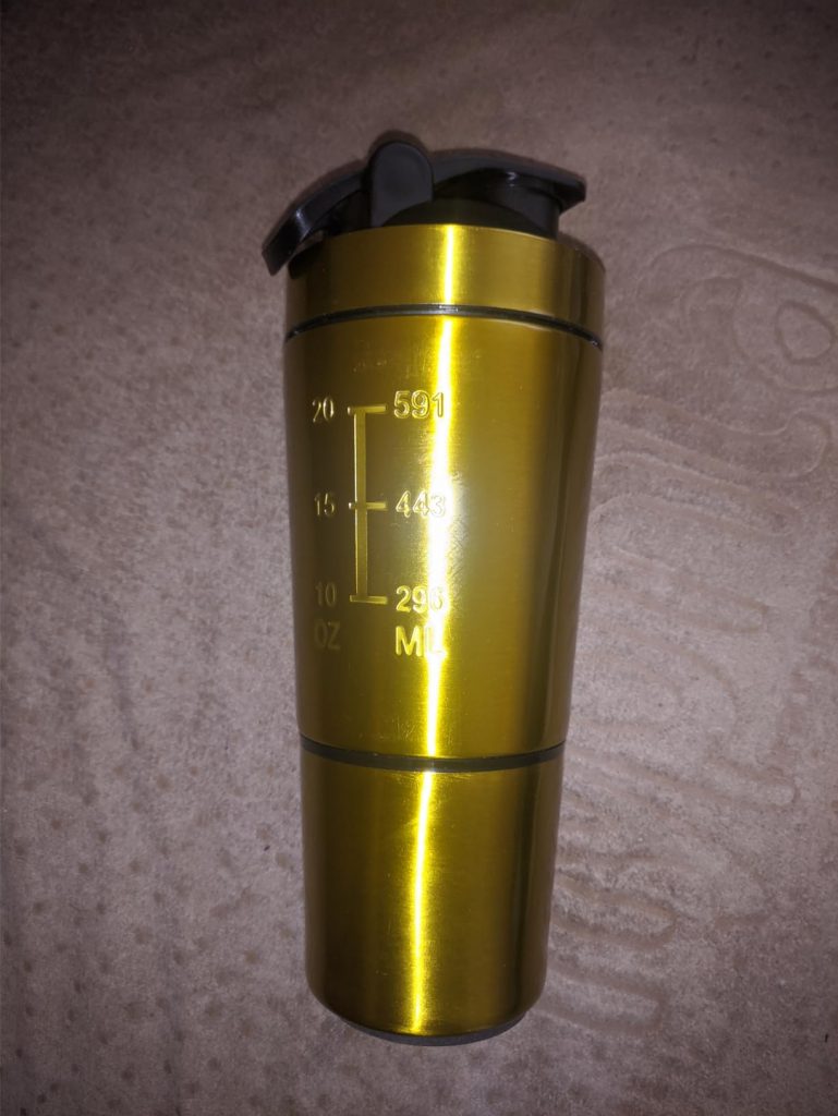 Le shaker en acier inoxydable remplit parfaitement son rôle. Son design doré avec des inscriptions noires est vraiment élégant. Il dispose d’un compartiment pour une dose supplémentaire de protéine et d’un réservoir principal de 750 ml, équipé d’une boule pour éviter les grumeaux. Le couvercle a une anse pratique et un système de fermeture robuste qui assure une bonne étanchéité. Cependant, j’ai remarqué quelques marques de frottement sur la surface à certains endroits, et le joint en silicone a tendance à se défaire, ce qui peut entraîner des risques. Un produit qui est à la fois efficace, esthétique et solide, même s’il présente quelques défauts !