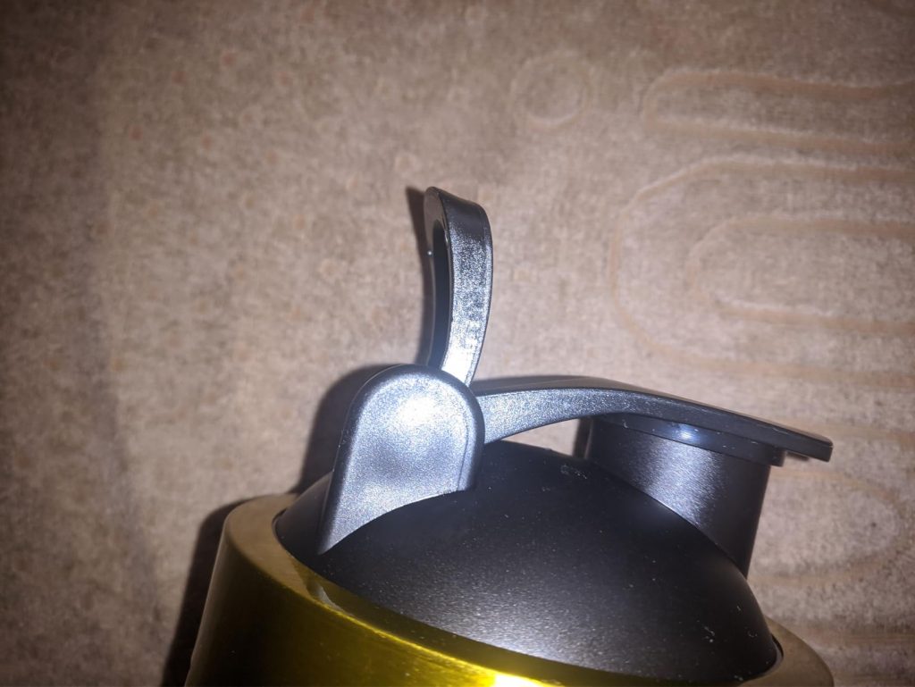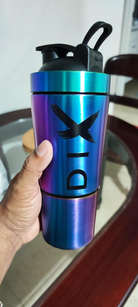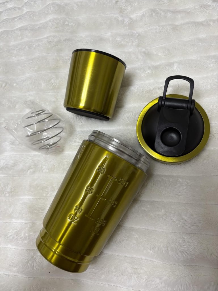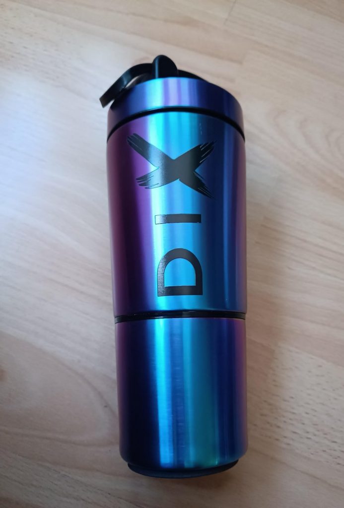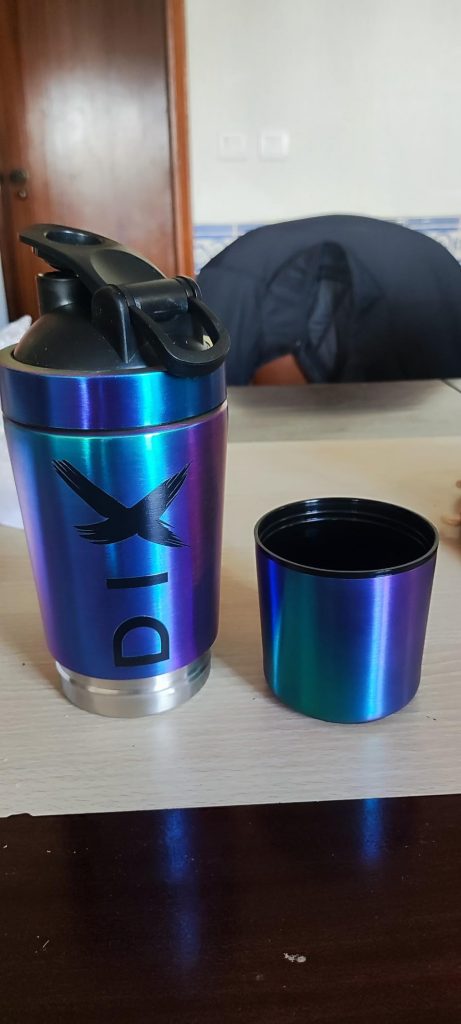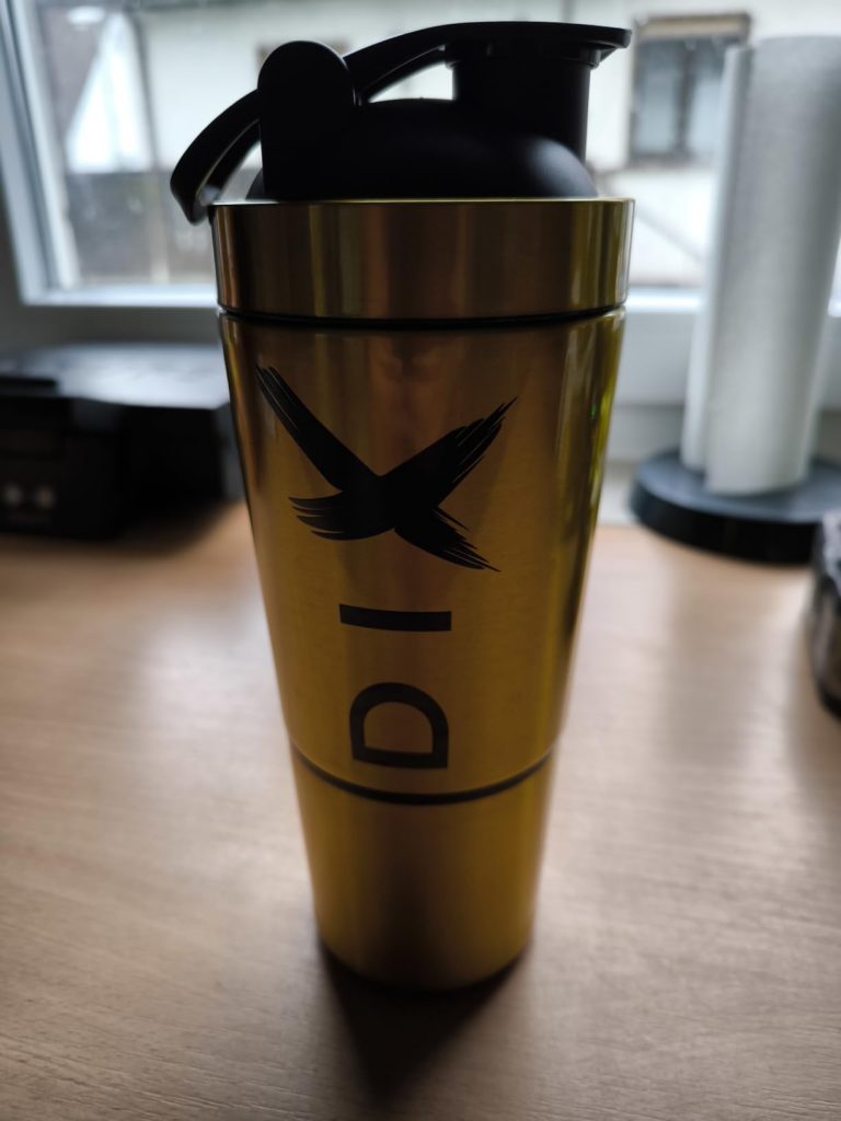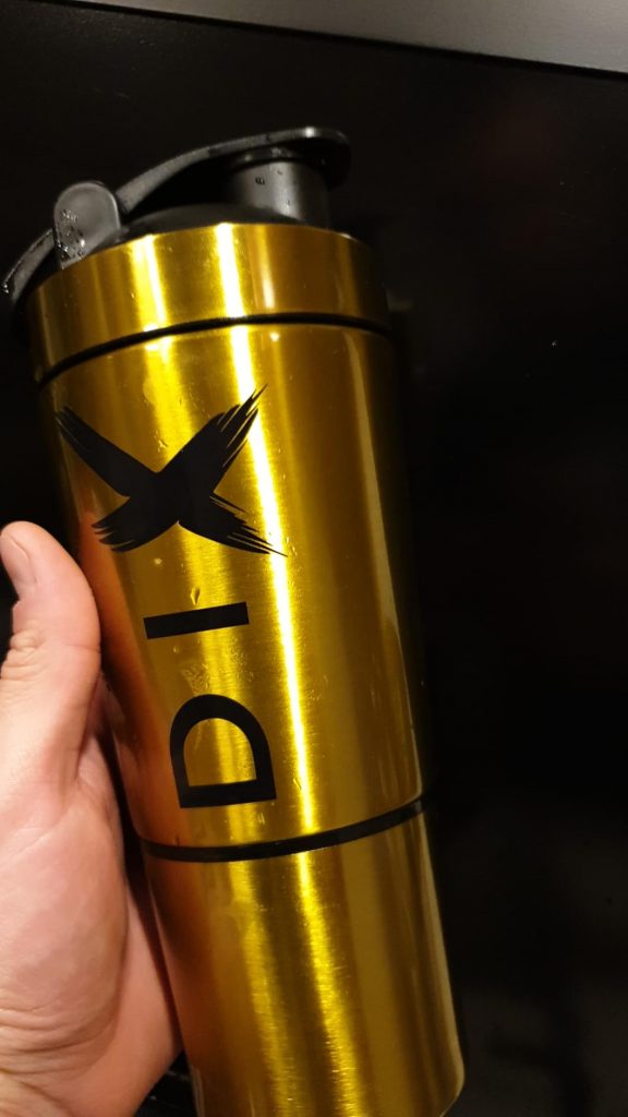 Le shaker en acier inoxydable remplit parfaitement son rôle. Son design doré avec des inscriptions noires est vraiment élégant. Il dispose d’un compartiment pour une dose supplémentaire de protéine et d’un réservoir principal de 750 ml, équipé d’une boule pour éviter les grumeaux. Le couvercle a une anse pratique et un système de fermeture robuste qui assure une bonne étanchéité. Cependant, j’ai remarqué quelques marques de frottement sur la surface à certains endroits, et le joint en silicone a tendance à se défaire, ce qui peut entraîner des risques. Un produit qui est à la fois efficace, esthétique et solide, même s’il présente quelques défauts !