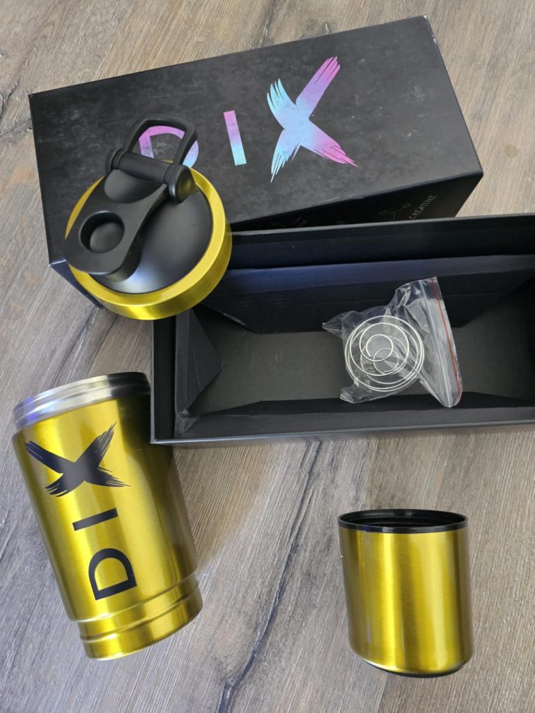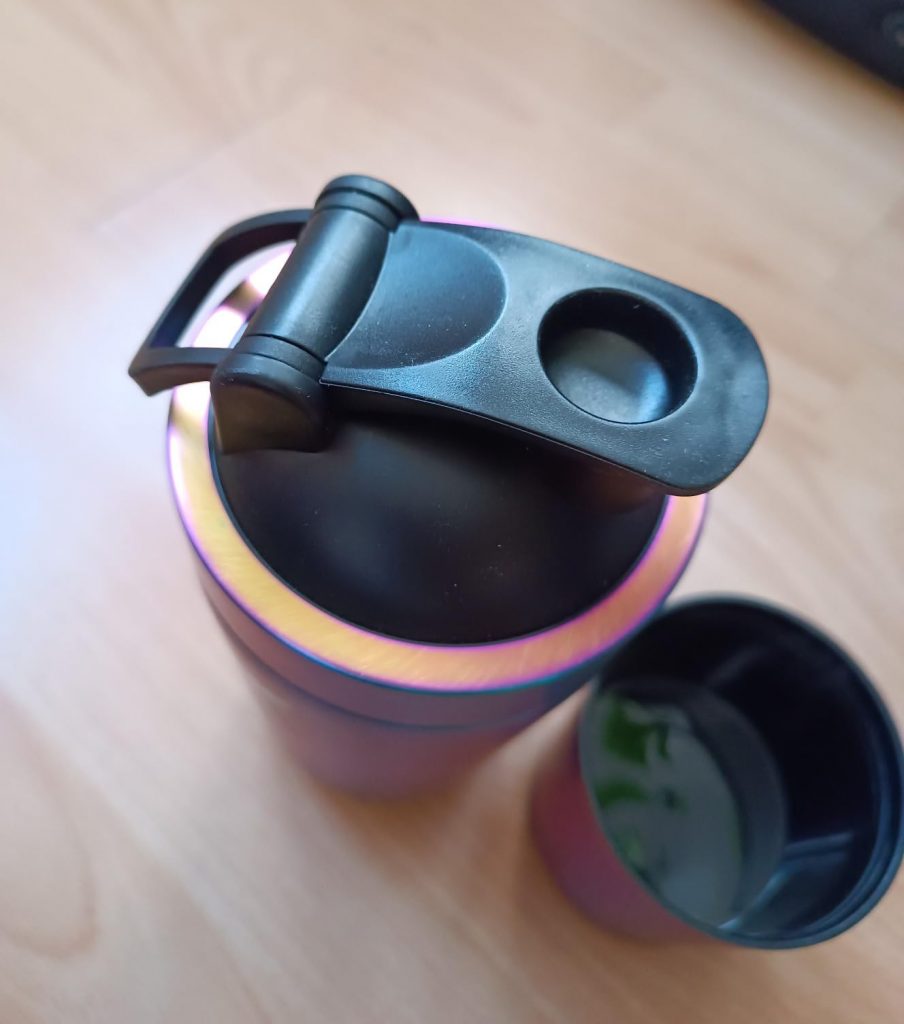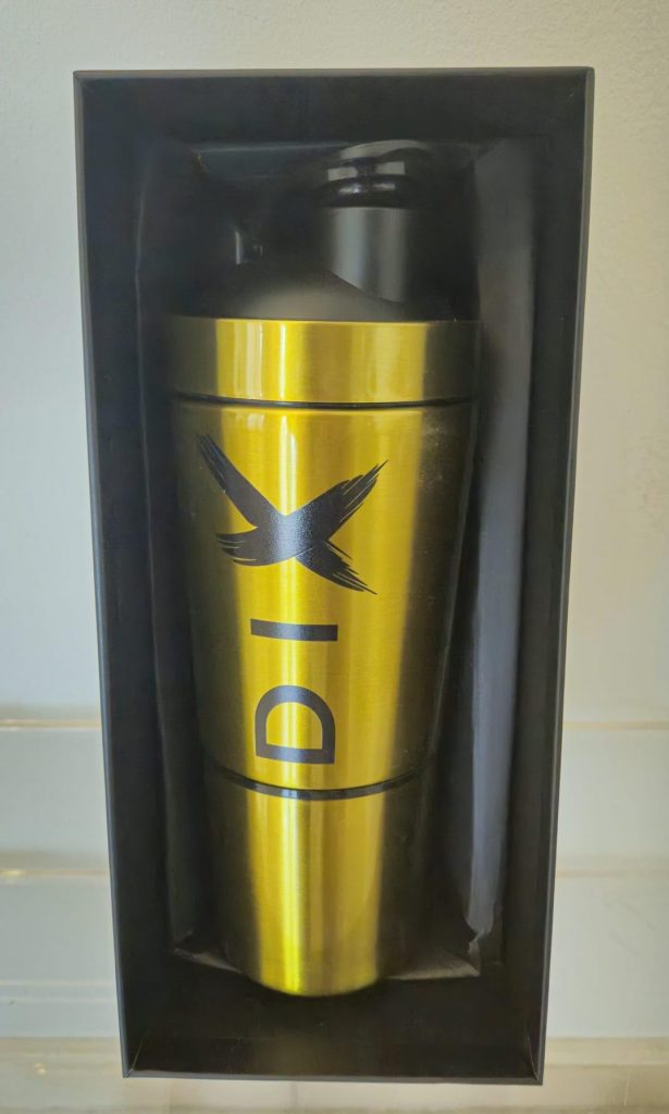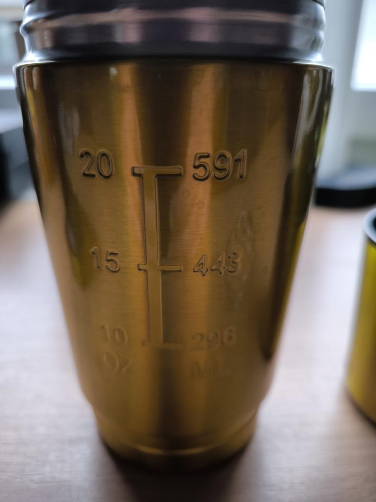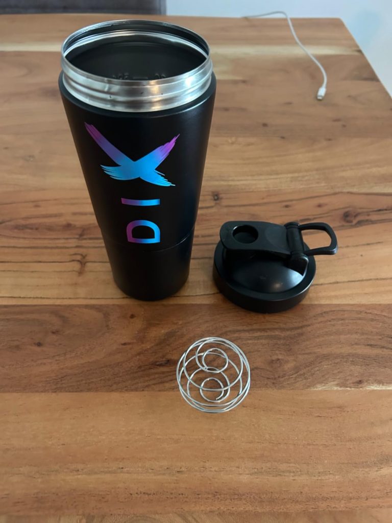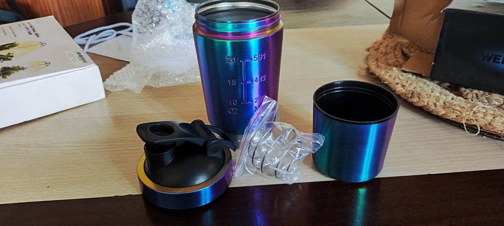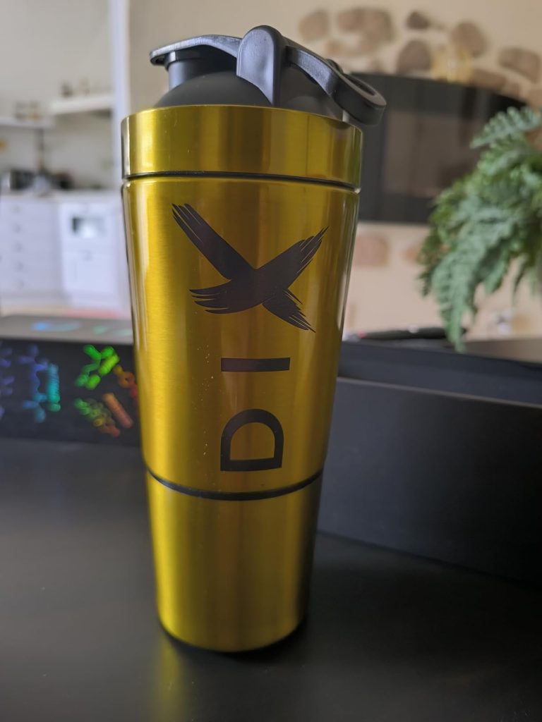 Le shaker en acier inoxydable remplit parfaitement son rôle. Son design doré avec des inscriptions noires est vraiment élégant. Il dispose d’un compartiment pour une dose supplémentaire de protéine et d’un réservoir principal de 750 ml, équipé d’une boule pour éviter les grumeaux. Le couvercle a une anse pratique et un système de fermeture robuste qui assure une bonne étanchéité. Cependant, j’ai remarqué quelques marques de frottement sur la surface à certains endroits, et le joint en silicone a tendance à se défaire, ce qui peut entraîner des risques. Un produit qui est à la fois efficace, esthétique et solide, même s’il présente quelques défauts !