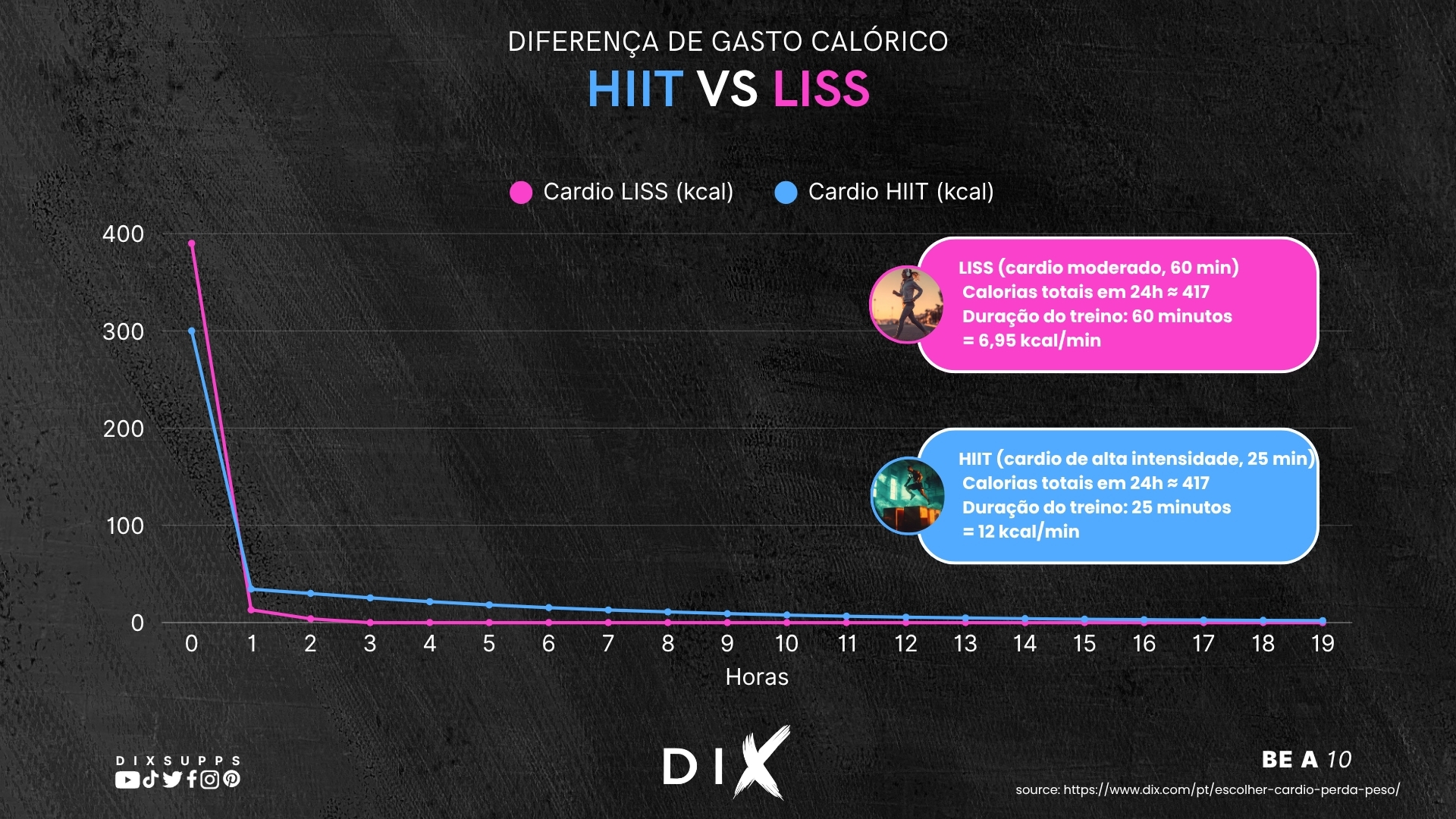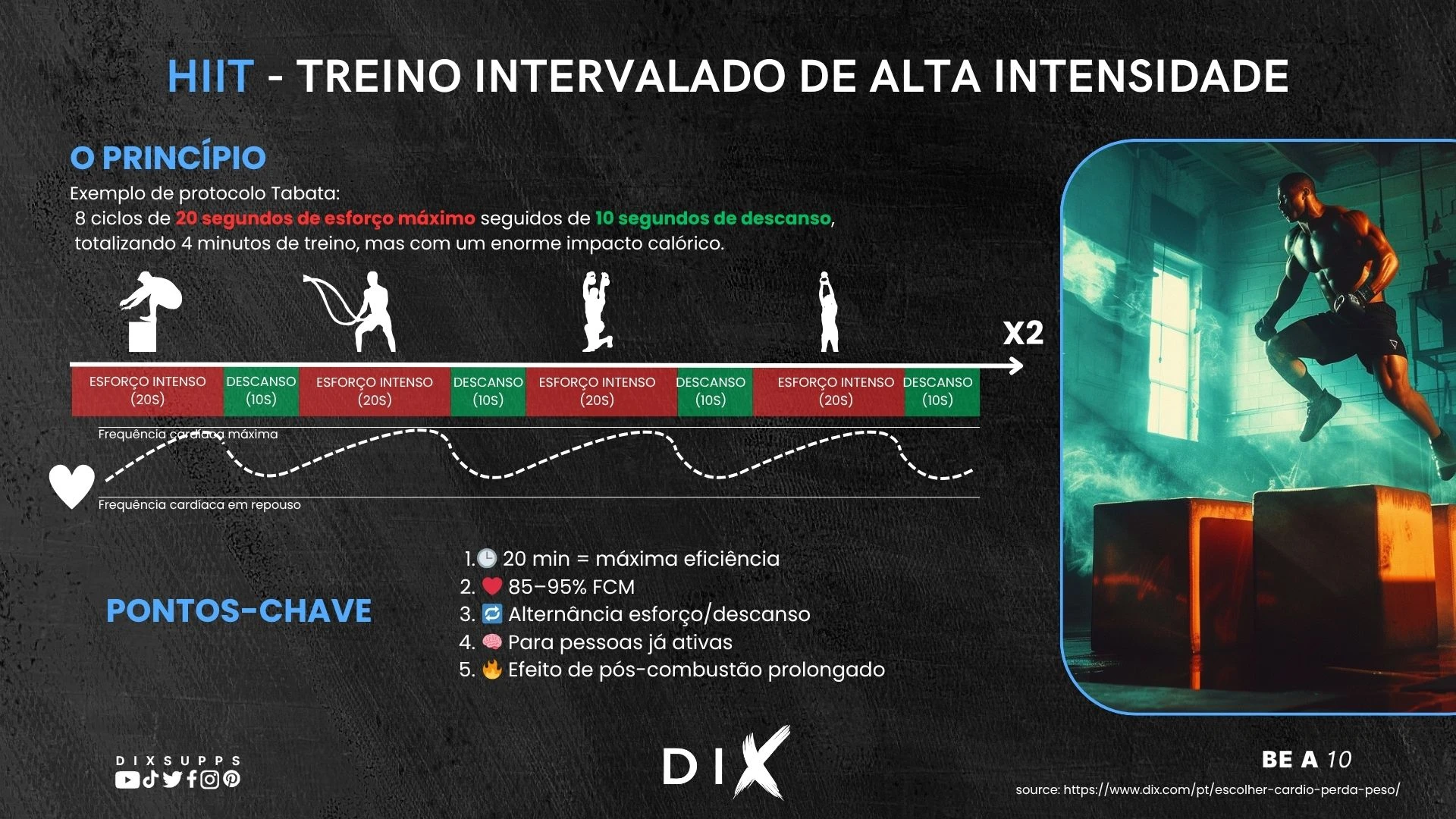 - O HIIT queima mais em menos tempo : Graças ao efeito EPOC, o corpo continua a queimar calorias várias horas após o exercício. Ideal para praticantes experientes que procuram uma perda de peso rápida, desde que evitem o excesso de treino.